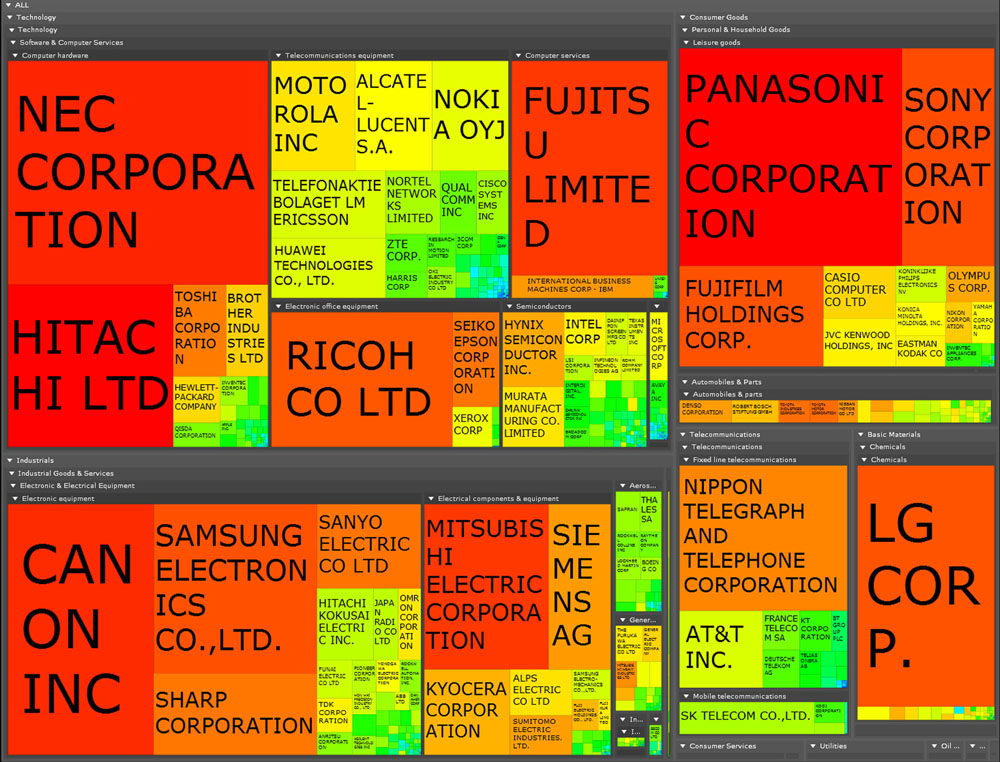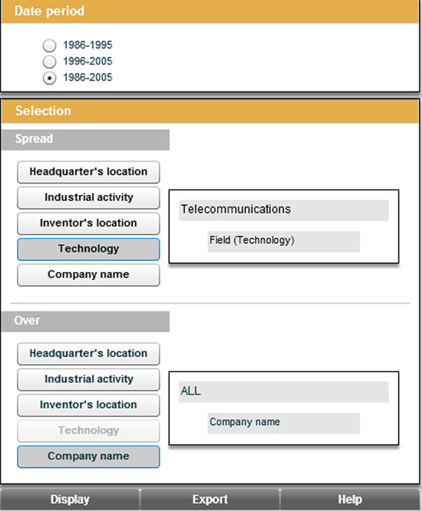 In the example above, we explore group’s portfolio of priority patent priority in technological domain of telecommunications. This is providing a ranking: the Top applicants (assignees) for the technological domain of Telecommunications in the world between 1986 and 2006. Thus from the visualization interface, it is also possible to expand the technology. In this example, for Telecommunications, the first five companies is: