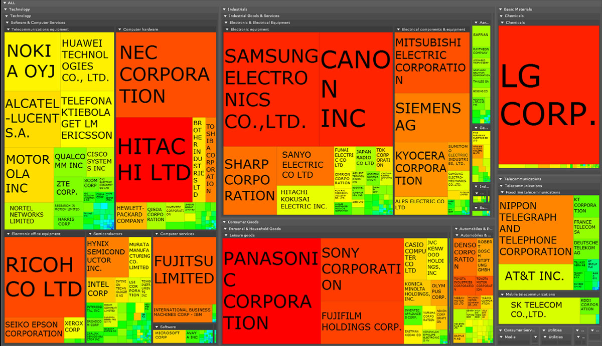 - Fixed line telecommunications : NIPPON TELEGRAPH AND TELEPHONE Corporation (7200 priority patents)